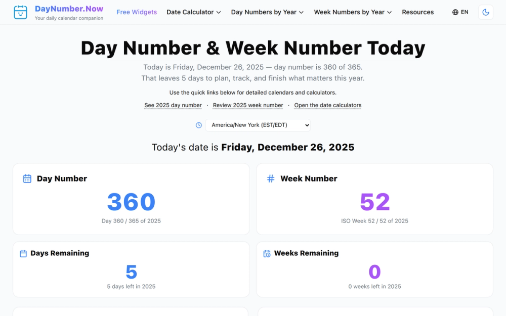 DayNumber.Now is a sophisticated web application that provides real-time tracking of day numbers, week numbers, and comprehensive date information. The tool calculates the current day of the year (1-365/366), ISO week numbers, and displays various date formats including ISO 8601, RFC 2822, and Unix epoch timestamps.