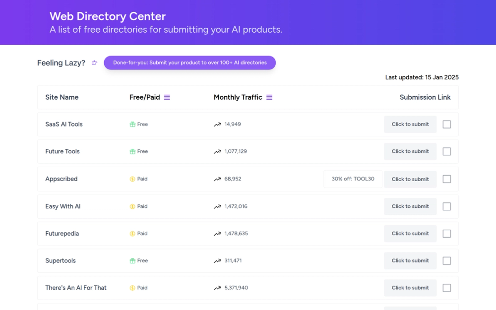 - Traffic Insights: Provides monthly traffic data for each directory to help prioritize submissions.
